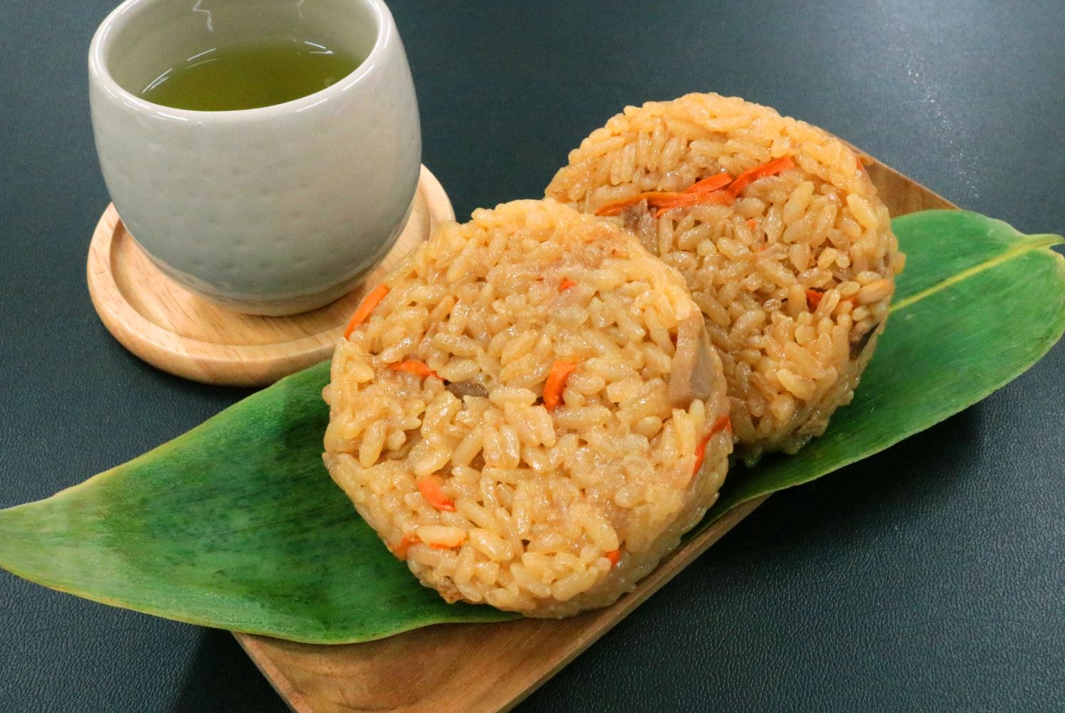 お醤油の旨みがしみこんだごはんと、鶏肉など五目具材を混ぜこみました。